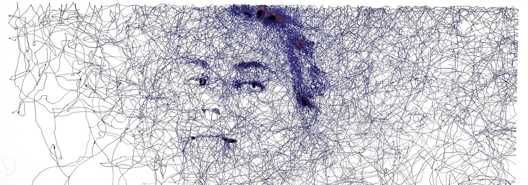 Je réalise des portraits à partir de tracés pseudo-aléatoires, réalisés au stylo bille, à l’encre ou au crayon. Ces entrelacs de lignes, apparemment désordonnés, sont le terreau dans lequel j’essaie de faire émerger des visages — des présences fragiles, parfois hésitantes, qui semblent se former à la lisière du chaos.